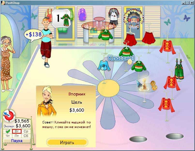 Цель игры Модный Бутик: вам необходимо из деталей одежды собирать полные комплекты костюмов. Комплект может включать от 2-х до 4-х деталей. Чем больше частей, тем дороже вы сможете продать костюм. Для начала вам дается несколько пар одежды, состоящих их 2-х частей. По мере накопления выручки, каждый день вам необходимо осуществлять закупку новой одежды или интерьера. Чем больше костюмов в игре, тем больше выручка. При покупке деталей интерьера добавляются различные бонусы (прибавка к цене товара, возможность воспользоваться паузой и т.п.). Приходящие покупатели заказывают нужное им количество одежды. Если удается собрать несколько, расположенных в ряд костюмов, то вам причитается бонус в виде мешка с деньгами. Вам нужно щелкнуть на нем несколько раз мышкой, чтобы определенная сумма денег прибавилась к вашему капиталу. Чем больше собранных в ряд костюмов, тем больше будет составлять ваш бонус. Одежда постоянно находится в движении, если вы не успеете собрать нужный комплект, то детали костюмов попадут обратно на склад, а с вас вычтут штраф. Вот почему необходимо как можно быстрее обслуживать клиентов.